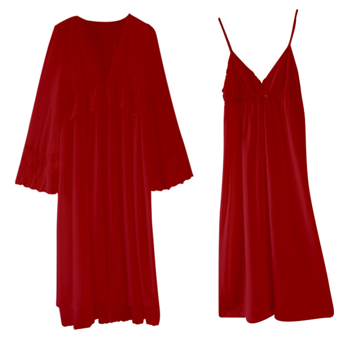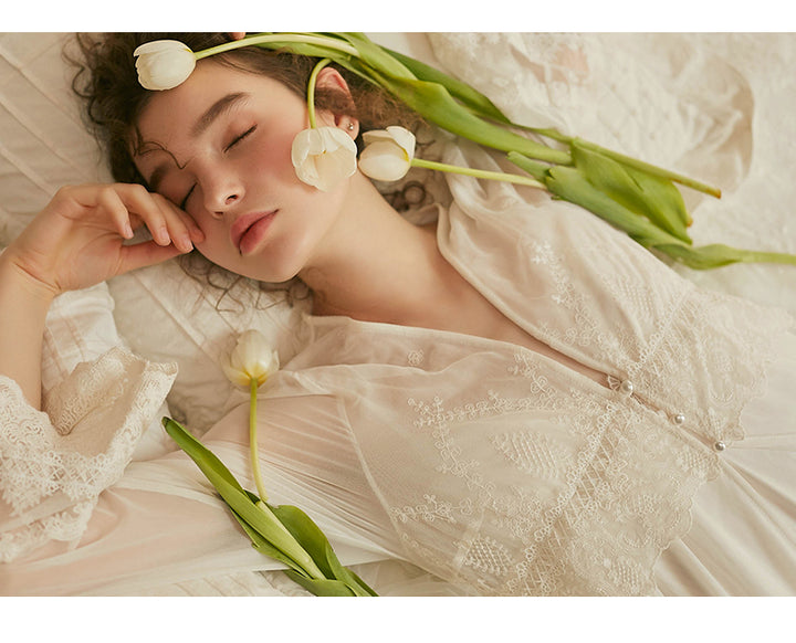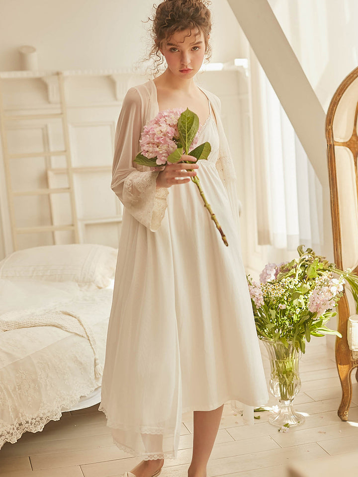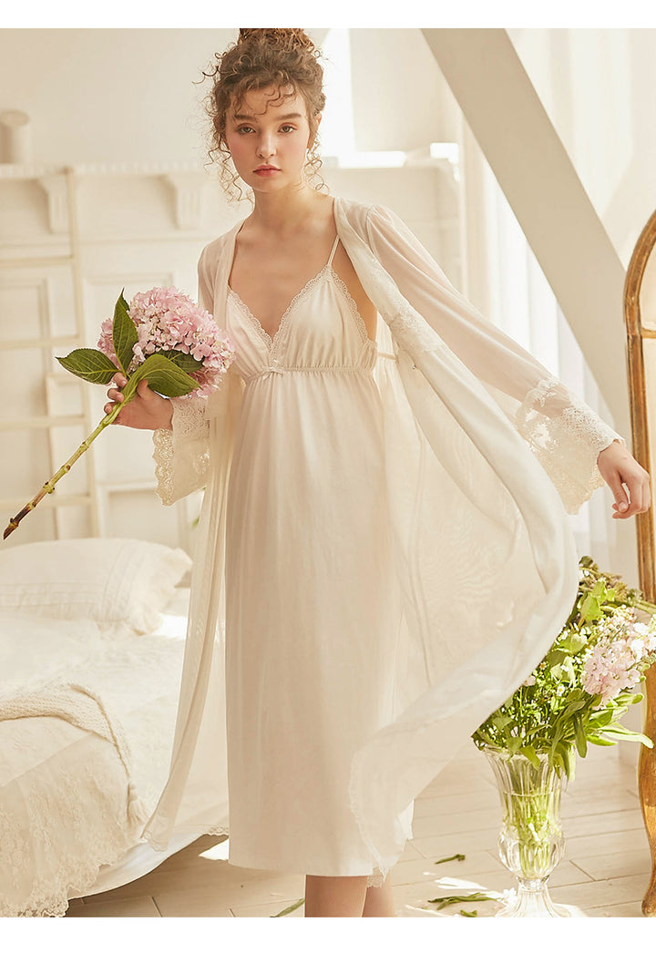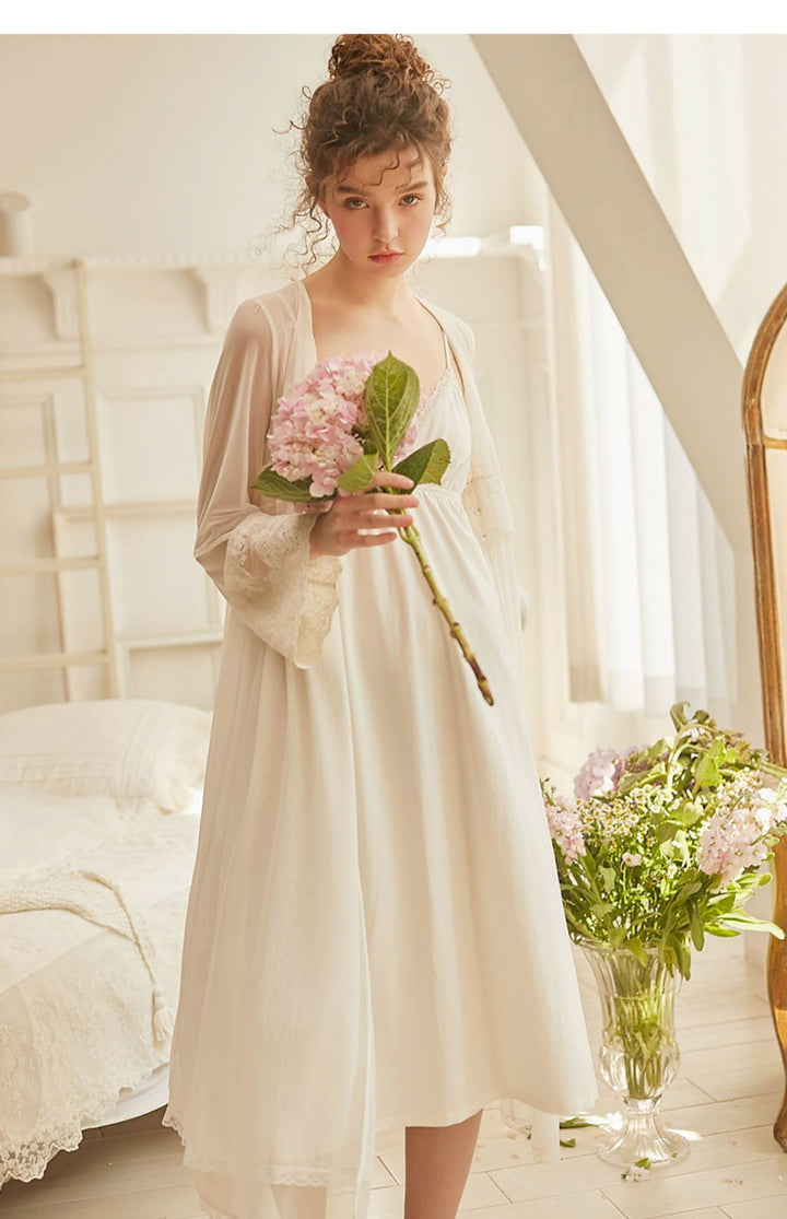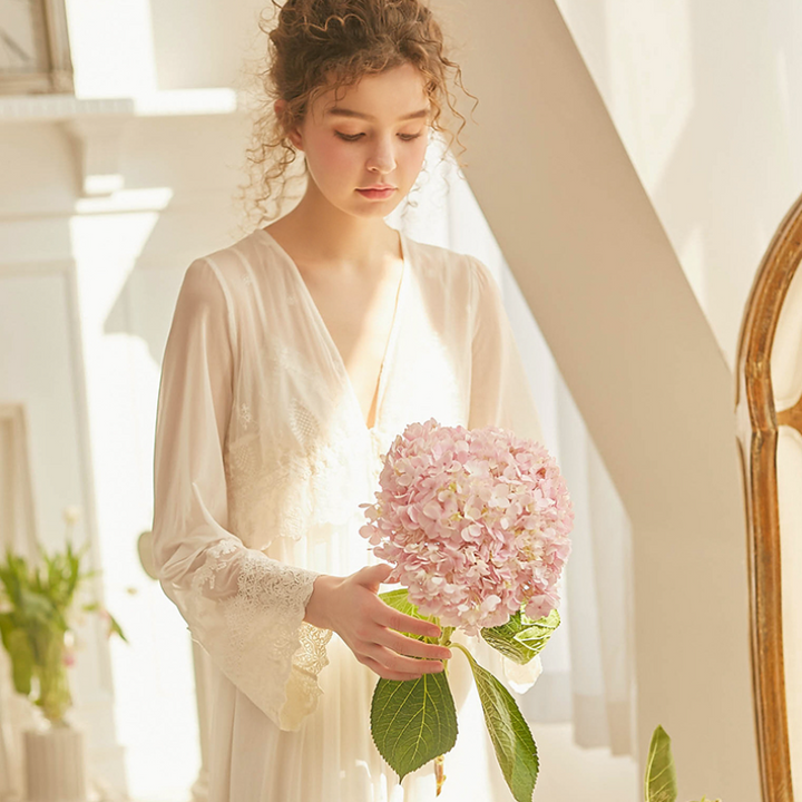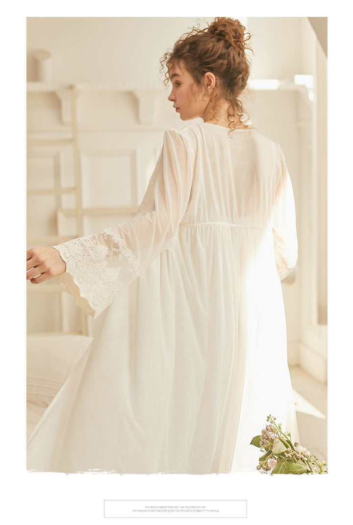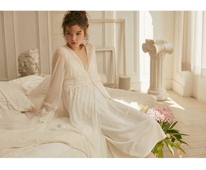 Spring and Summer Sexy Lace V-neck Mesh Palace Style Long Sleeve Nightgown Suspender Skirt Pajamas Two-Piece Set