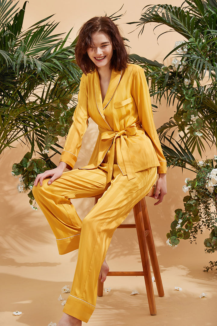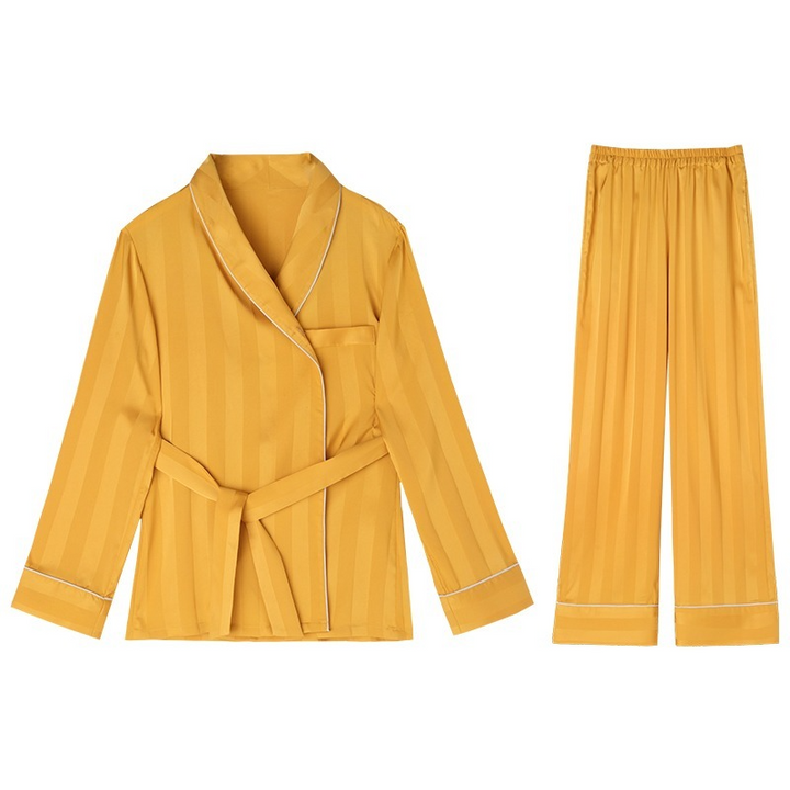 Women's yellow long-sleeved lace-up silk pajamas two-piece housewear suit female autumn